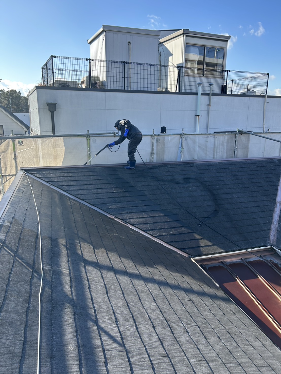 高圧洗浄で、屋根の汚れを落とします。屋根と塗料の密着性を高めるために重要です。