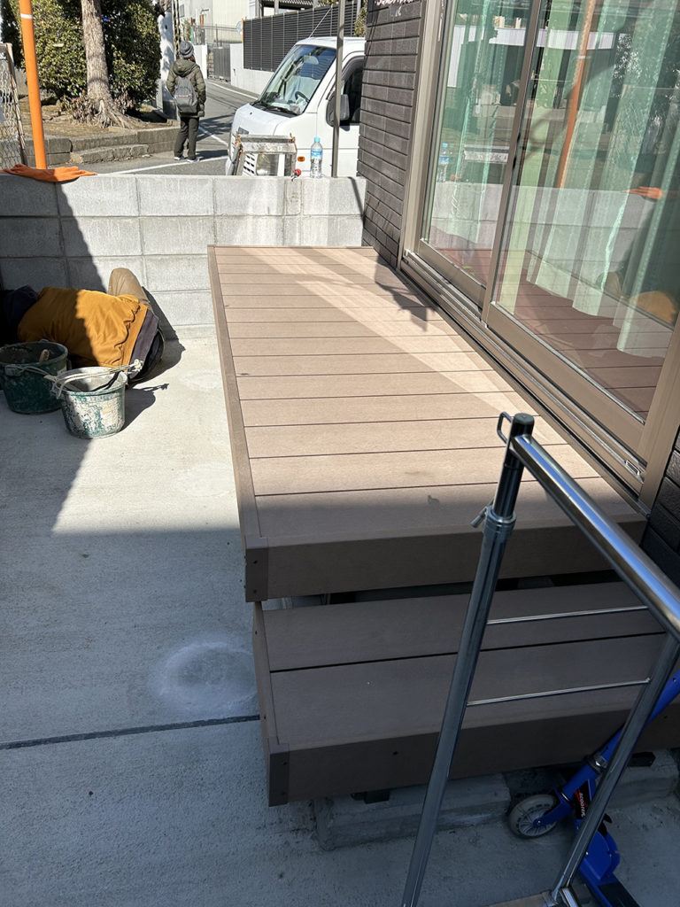 庭部分を整地して舗装し、ウッドデッキを施工しました。